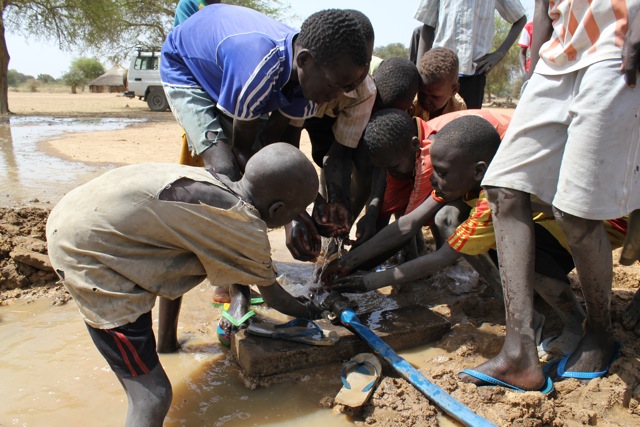 When we arrived at the first school, water was flowing! The hand pump was not yet installed, but the drillers were pump testing to determine the hourly yield of the well. Yet, that was no deterrent to the many children who could not stay away from the excitement of fresh water. It was hot and they were very happy. The local women were already filling their containers with water as the head teacher and community members were monitoring everything and assisting with any needs of the drillers. It was a happy day for all and a beautiful sight to behold.